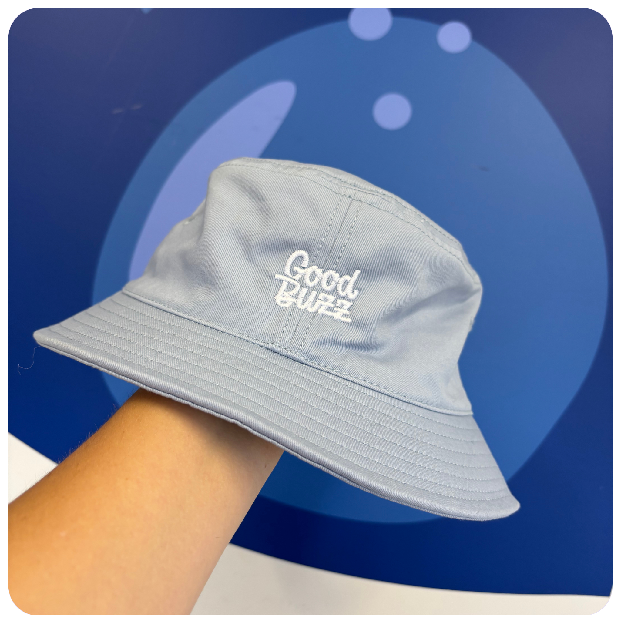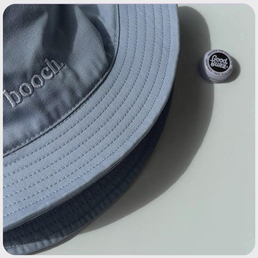 Keep it cool (and keep your head covered) with our ice coloured bucket hat. Featuring a subtle booch hit on the front and the Good Buzz party detail at the back, this one is made for long summer days.