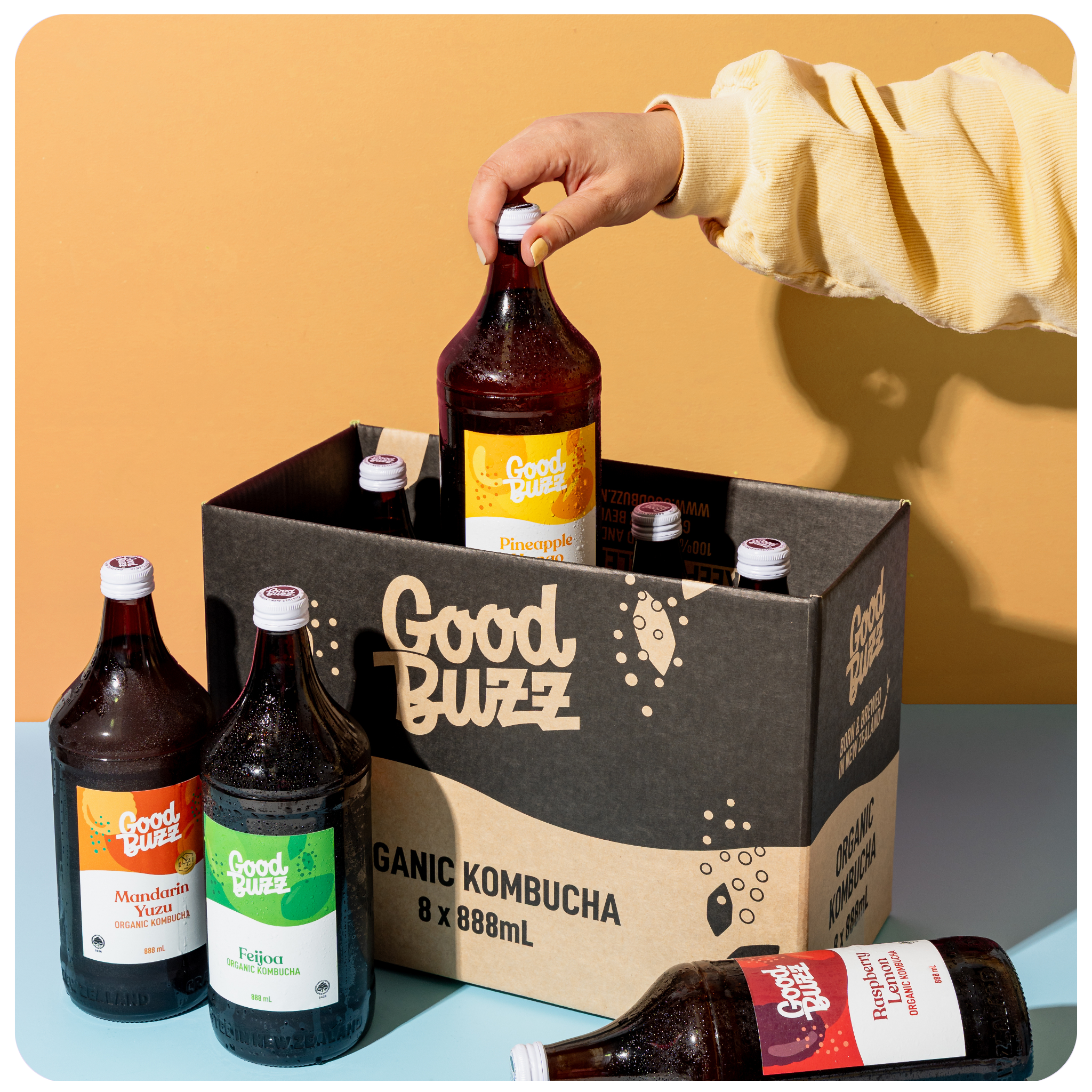Good Buzz Kombucha is fermented traditionally, taking place with a symbiotic culture, (or SCOBY as favourably known) combined in a lightly sweetened tea brew.